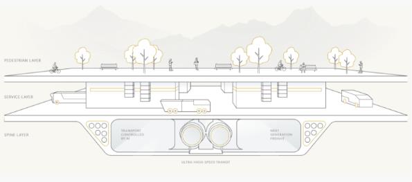 這座城市綿延約170公里,整體將與大自然融為一體。地下一層是行人專區,另外兩層則用于基礎設施和公共交通建設。雖然沒有私家車,但是無論生活、工作還是娛樂,步行的話都能夠在五分鐘內到達。即使乘坐公共交通,日常通勤時間也不會高于20分鐘后。