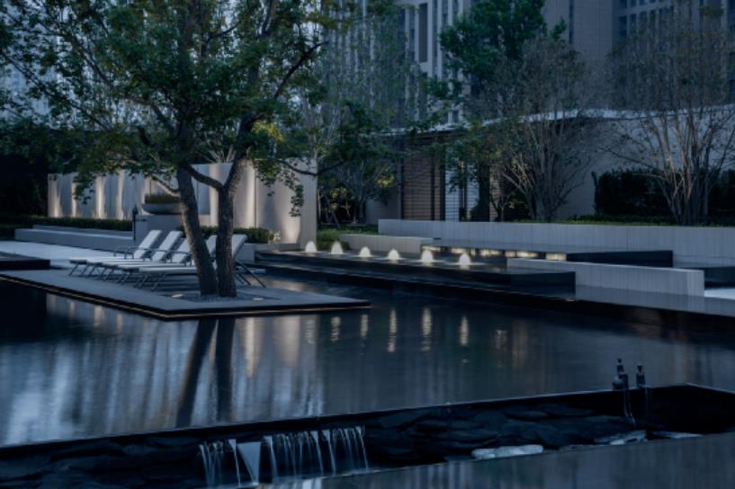 ????? 有良好的倒影效果,水面上的物體由于倒影的作用,給人以詩意、輕盈、浮游和幻想的視覺感受。風(fēng)和景明,波光沁碧。石之重疊立構(gòu),水之清澈靜美,木之溫潤(rùn)拙樸,與風(fēng)、陽光相互呼應(yīng),傳遞自然的溫度。度假感的輕松氛圍在秩序與自然中悄然而生,形成寧靜超脫的場(chǎng)地力量。水,映射萬象,理性的線條形成空間的開合,融入留白意境,留下無限遐想。