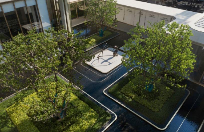 ??????? 姿態(tài)搖曳的烏桕,平靜如鏡的水面偶爾吹來一陣細(xì)軟的清風(fēng),每個(gè)人總需要這樣的幻彩凝香,回歸自然,為美好駐足留望;水面與陽光為伴,映射出五彩紛呈的理想世界……時(shí)而蕩漾的水面上流轉(zhuǎn)著華麗的色彩,設(shè)計(jì)師將它叫做“幻彩”;金屬質(zhì)感的流動(dòng)線條,縈繞在水面以及水底,水面的線條構(gòu)建出幾座精致的綠色小島,它們被綠植簇?fù)恚瑢哟畏置鳎c(diǎn)綴著一棵棵形態(tài)優(yōu)美的叢生烏桕。水底的線條隨著“綠島”圍繞又延續(xù),讓水景不僅在色彩上幻彩多姿,在結(jié)構(gòu)與畫面感上也充滿著光怪陸離的視覺沖擊。