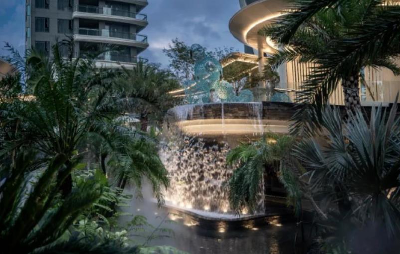???? 瀑布從將近5米的空中奔流而下,匯于郁郁蔥蔥的熱帶雨林下沉庭院,形成的溪流,穿梭于熱帶風(fēng)情的綠化之中。瀑布掩映在高低錯(cuò)落的熱帶種植中,彎桿銀海棗、美麗針葵、圓葉軸櫚、彩虹鳥蕉、箭羽竹芋、青蓮竹芋等植物將此區(qū)域渲染出了濃郁的熱帶風(fēng)光。結(jié)合柔和的燈光,水霧,將人帶入了仙境。整個(gè)下沉花園煥發(fā)出勃勃生機(jī),體現(xiàn)世界的面貌以及人類與大自然曾經(jīng)的zui原始的關(guān)系。